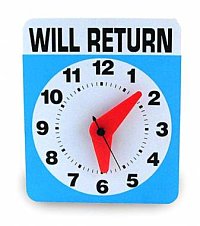 Asiakaspalvelutehtävissä on varmasti joskus monia turhauttavia tilanteita, jolloin tekisi mieli jäädä päivän kauniiksi lopuksi ikitauolle. No nyt se onnistuu. ”Will Return”-kello näyttää viattomalta ”Palaan pian”-kyltiltä, mutta on tietysti kello, jonka avulla asiakaspalvelusta tulee varsin helppoa. Toisaalta odottavan aika on sitten sitäkin pidempi. Idea toimisi hyvin myös parkkikiekossa.