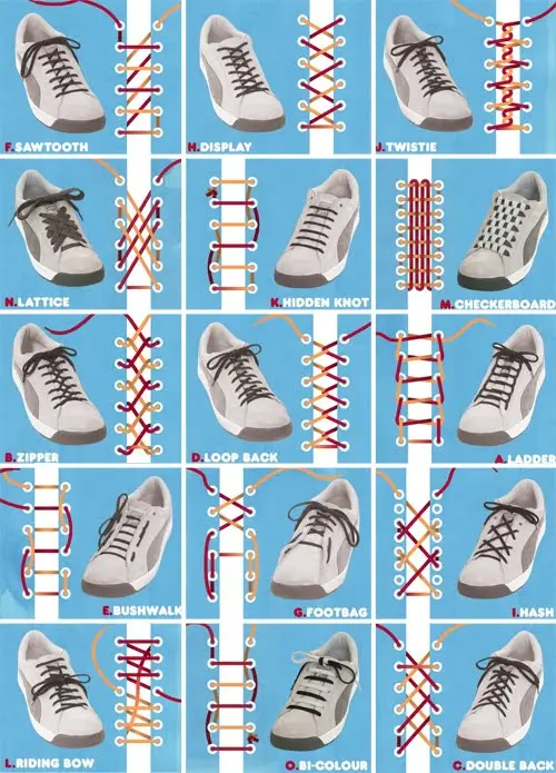 Voihan ne nauhat pujottaa muullakin tavalla kuin mitä Intersportissa laitetaan. Mutta enpä ole tiennyt, että vaihtoehtoja on näin monia! Voisinpa kokeilla Checkerboardia tai Ladderia. Vaikka kyllä kaikki näyttävät tyylikkäiltä. Mielenkiintoista, että esimerkiksi, että footbagia varten on oma pujotustyyli. Siitä sitten tunnistanee todelliset pro:t tai sitten wannabe-pro:t. Näin voit oppia lisää kengännauhojen tapaa pujottaa sitomisesta;