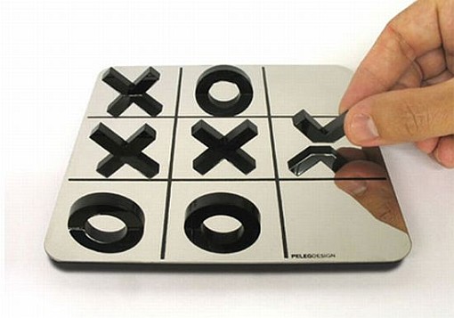 Ristinolla yhdeksän ruudun laudalla ei välttämättä ole peleistä kaikkein haastavin, mutta tämä ei suinkaan estä pelikonseptin kääntämistä hienoksi design-esineeksi. Tässä idea, kuinka ristinollan pelilautana käytetty peili täydendää pelimerkkien puolikkaat hienosti muistuttamaan kokonaisia.