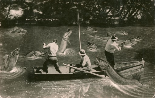 Yllä olevan postikortti 1900-luvun alusta on varsin onnistunut esimerkki hyvästä kuvamanipulaatiosta. Kuvan kehitysvaiheessa on yksinkertaisesti yhdistetty pöydällä makaava hauki kuvaan tyhjästä junavaunusta ja illuusio jättiläiskalasta on valmis. Tämän kaltaisia postikortteja käytettiin mm. matkailun edistämistarkoituksissa ja uskoisin, että tämäkin postikortti herätti hilpeyttä ja hyvää mieltä saajassaan.
