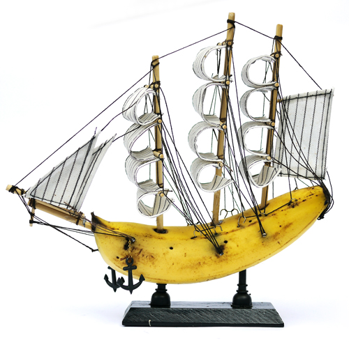 Tanskalainen taiteilija Jacob Dahlstrup esitteli banaanilaivoja Shoreditchin kaupungintalolla Lontoossa jokunen aika sitten. Laivat on rakennettu taidokkaasti panaani runkona. Tikut ilmentävät mastoja ja narulla on viritetty purjeet, jotka ovat kangasta. Ankkurit saattavat olla korvakoruista tai Legoista, en osaa varmuudella sanoa.