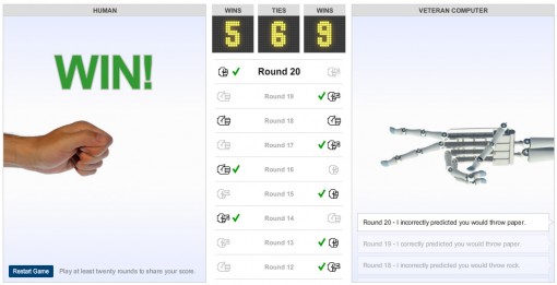 Ihmisen ja koneen väliset kamppailut eri peleissä, shakista aina keilaamiseen ovat populaaritieteen kestosuosikkeja. Tällä kertaa on tullut vuoro koneen ja ihmisen ottaa mittaa perinteikkäässä taitolajissa nimeltään kivi-sakset-paperi. Ihmisten keskimääräistä käyttäytymistä ennustava, New York Times -lehden verkkosivuille pystytetty kamppailulaji löytyy osoitteesta nytimes.com