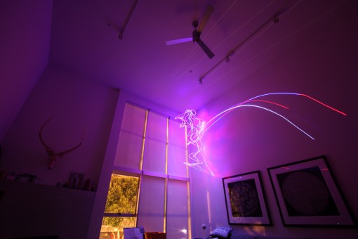 Varmasti lähes jokainen valokuvauksen harrastaja on joskus kokeillut ”maalata” kuvia filmille pitkällä valotusajalla varustetulla kameralla ja esimerkiksi taskulampulla. Mutta onko kenellekään tullut aikaisemmin mieleen käyttää valomaalauksen pensselinä radio-ohjattavaa helikopteria? Tällaisen päähänpiston sai kuitenkin Flickr käyttäjä flight404. Koska halvoissa, muutaman kympin radio-ohjattavissa on tavallisesti jonkinlainen led-valo jopa valmiina mukana ei hommaan tarvita kopterin lisäksi enää muuta kuin hämärä huone, kamera pitkällä suljinajalla ja ripaus pilotintaitoja.