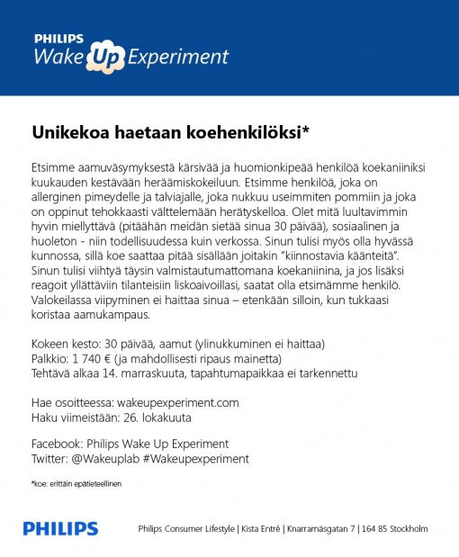 Oletko aina ollut sitä mieltä, että sinun erityislahjasi on nukkuminen? Mikäli vastaus on kyllä, niin nyt olisi tarjolla sopiva työpaikka juuri sinulle. Elektroniikkavalmistaja Philips on julkaissut työpaikkailmoituksen, jossa haetaan aamu-unisuudesta kärsivää koehenkilöä testaamaan kuukauden ajan Philipsin uutta Wake Up Light herätyvaloa. Ja kyllä, tästä työstä maksetaan jopa palkkaa. Nukkuja saa kuukauden unipalveluksistaan korvaukseksi 1740 euron palkion. Philipsin julkaisema ”työpaikkalmoitus” ohessa. Hakemuksia otetaan vastaan 26.10 saakka.