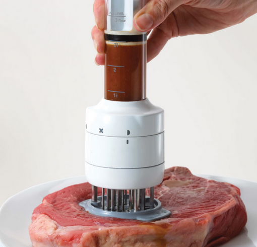 The Marinade Infusing Meat Tenderizer on normaalia mureuttamiseen käytettävää laitetta muistuttava härpäke, josta löytyy lisäksi eräänlainen säiliö marinadille. Kun lihaa sitten painellaan tällä työkalulla, pumppautuu samalla sen sisään maukasta marinadia.