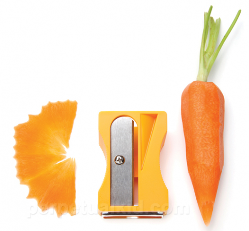 Pirteän oranssin värinen terotin on normaalia kyniä varten suunniteltua laitetta hieman suurempikokoinen. Porkkanoiden lisäksi hilavitkutin soveltuu muun muassa kesäkurpitsoille, palsternakoille ja pienille kurkuille. Laitteella voi kuoria kyseiset vihannekset normaalisti, minkä lisäksi nämä suupalat voi halutessaan teroittaa kuin lyijykynät.