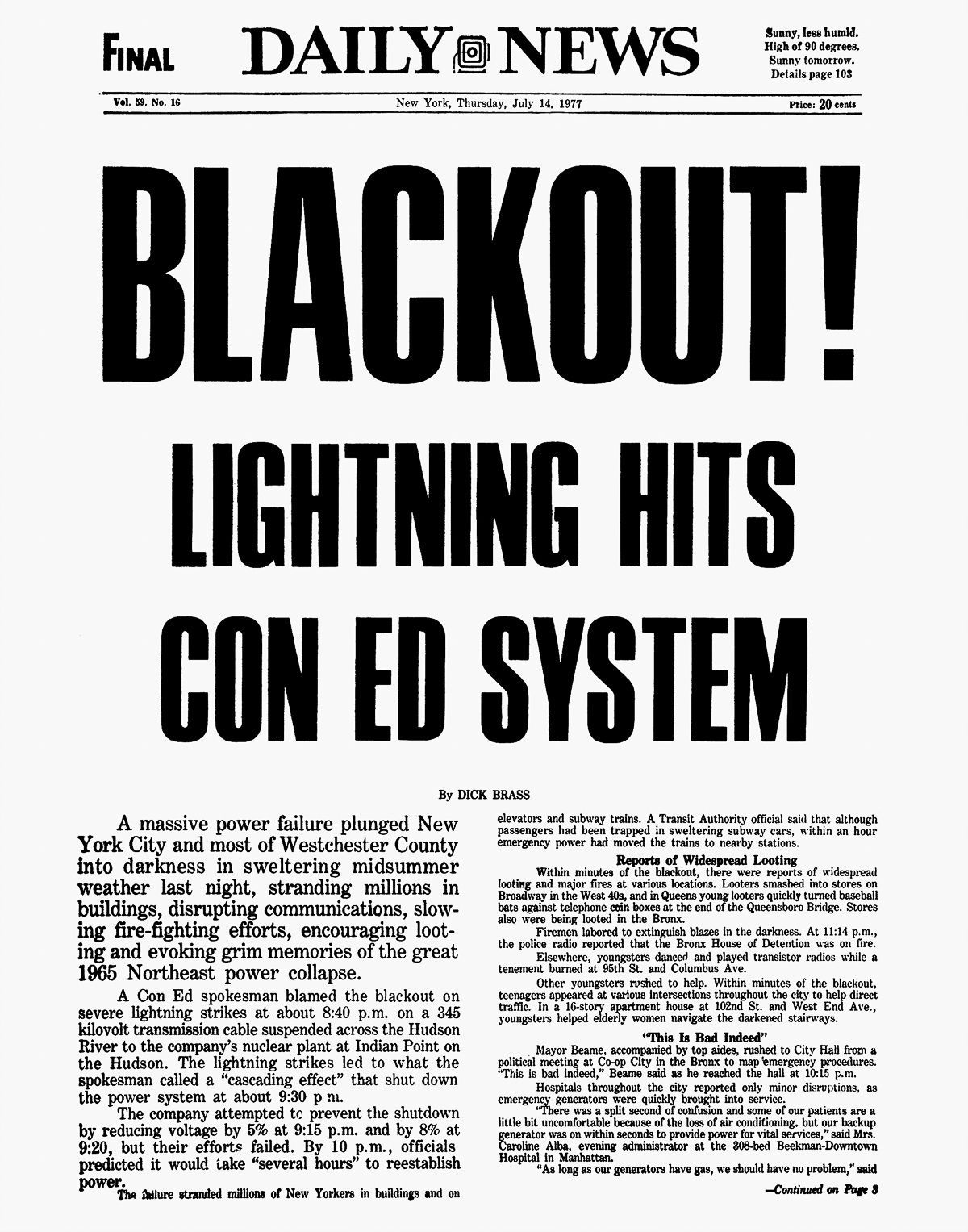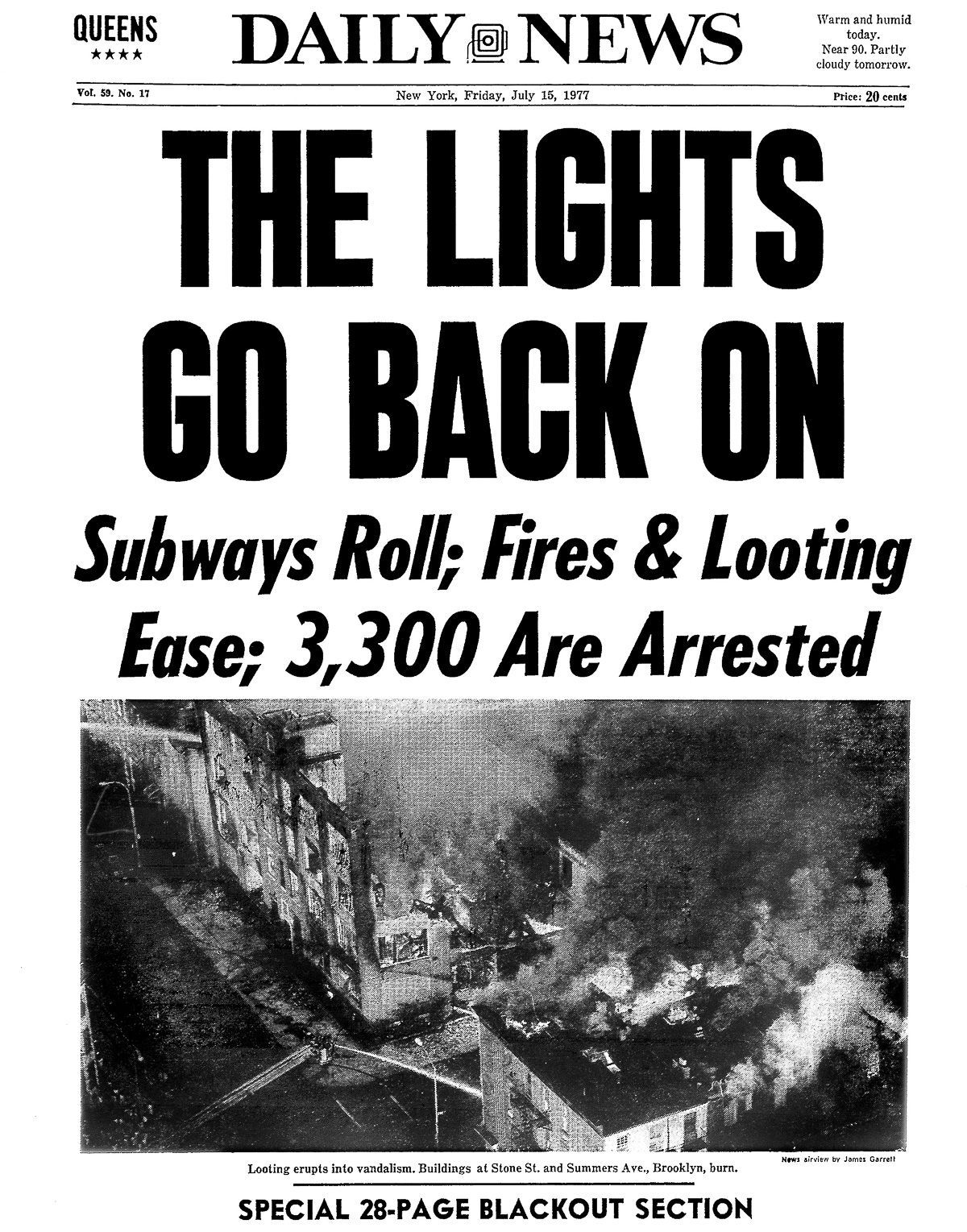New York Cityssä pimenivät valot 13.-14. heinäkuuta 1977. Vain eteläinen Queens, Rockawayn ympäristö sekä Pratt-instituutin kampus Brooklynissä olivat valot päällä. Queens sai sähkönsä Long Island Lighting Companylta, Pratt-instituutilla oli oma generaattori.