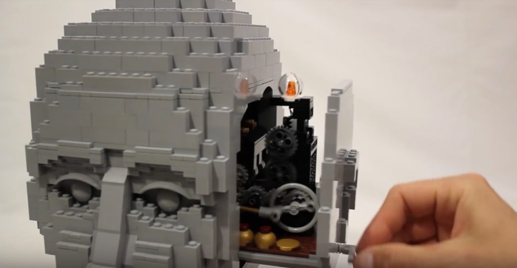 Miltä näyttää Lego-suunnittelijan päässä? Oheinen teos esittelee, että siellä pyörii rattaita ja loistaa keksimislamppu.