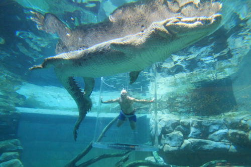 Nimittäin Australian Darwinissa on krokotiilipuisto (Crocosaurus cove), jossa on n. 200 tällaista matelijaa. Paitsi että eläimiä saa tutkia ja silitellä, Gage of Death päästää kokemusseikkailijan aivan iholle. Nimittäin 4cm-paksuisesta akryylista valmistettu kuusikulmionmuotoinen tankki lasketaan vaijerilla yli 5-metristen krokodiilien sekaan. 15 minuutin sukelluksella saa lähikontaktin ja etenkin samanaikainen ruokinta parantaa kokemusta.