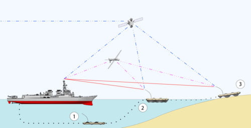 Operaatio-kaavio, jossa Velox lähtee laivalta veden alta ja tähystää ennen rantautumista