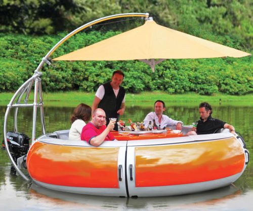 Tämä pyöreä vene on 3,6 metrin levyinen ”kelluke”, jonka keskellä on n. 60cm kokoinen grillipylväs hiiligrillillä.