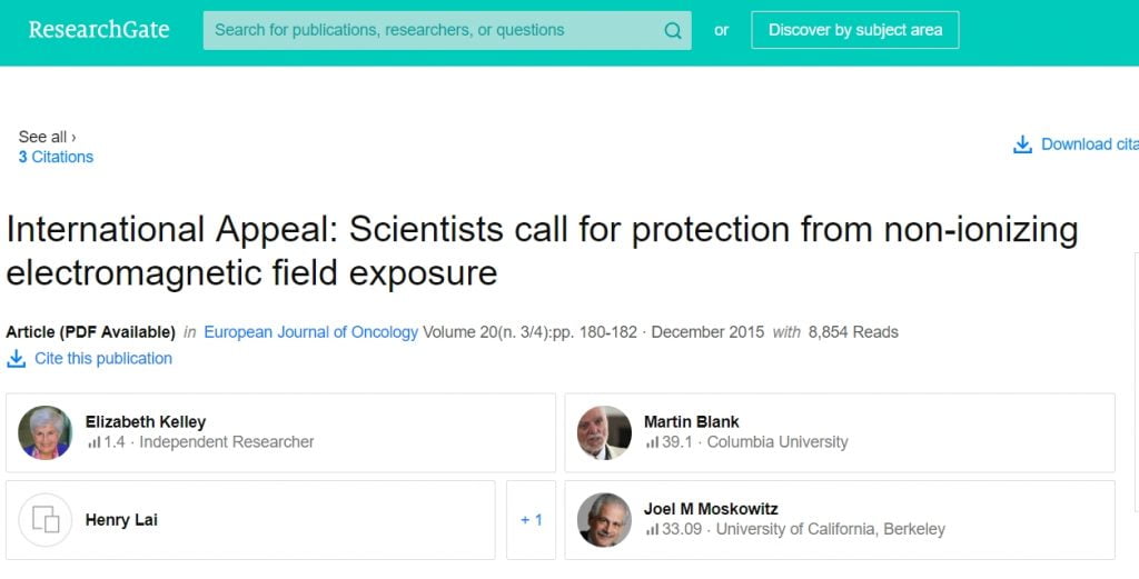 ”We are scientists engaged in the study of biological and health effects of non-ionizing electromagnetic fields (EMF). Based upon peer-reviewed, published research, we have serious concerns regarding the ubiquitous and increasing exposure to EMF generated by electric and wireless devices. These include–but are not limited to–radiofrequency radiation (RFR) emitting devices, such as cellular and cordless phones and their base stations, Wi-Fi, broadcast antennas, smart meters, and baby monitors as well as electric devices and infra-structures used in the delivery of electricity that generate extremely-low frequency electromagnetic field (ELF EMF).”