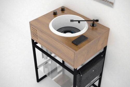 OLMYPIA-kylpyhuoneliike on suunnitellut erityisen vinyyli-teemaa käyttävän kylpyhuonesisustuksen. Tässä kenties hienoin yksityiskohta on vinyylisoitinta muistuttavat lavuaarit.