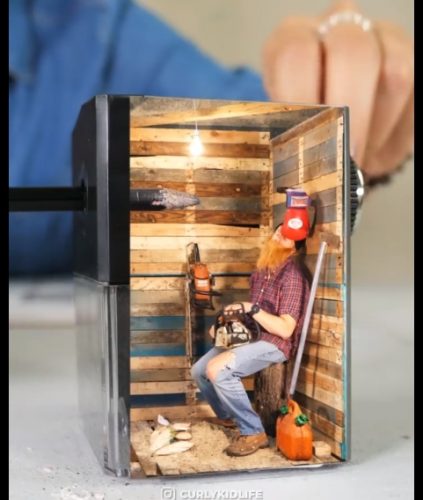 Elikkä siellähän on pieni parrakas tonttu, joka pyöritetään hereille. Tonttu ottaa minimoottorisahan ja sahailee kynän teräväksi. Näinhän se voisi toimia myös.
