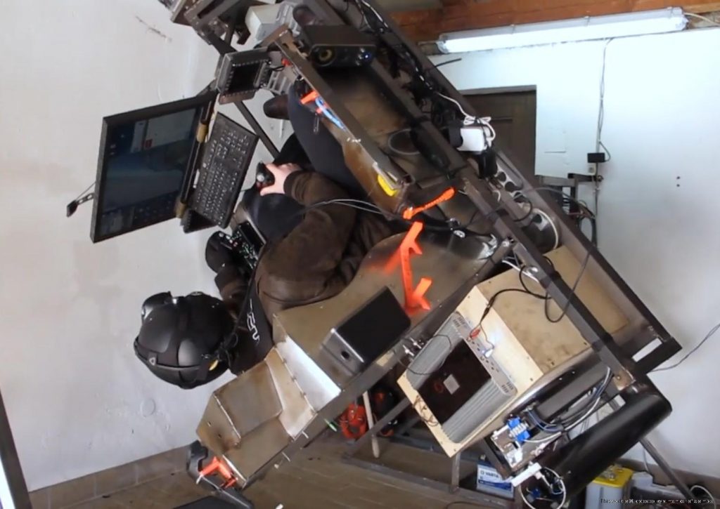 Melkoisen pätevä lentosimulaattori. Tämä rakentelija on kehittänyt lentosimulaattori-tuolin, joka kiertyy 360 astetta ja jonka turvavyöt kiristävät n. 3,5g voiman tunteen.