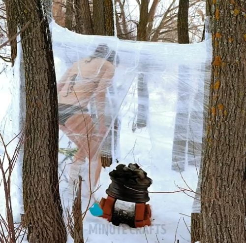 Muovikelmusta pikasauna talviseen metsään. Pystytys ja purku on nopeaa!