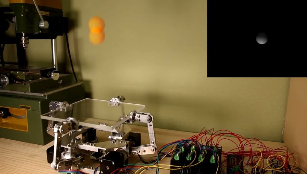 Tässä ovela laite nimeltään Octo-Bouncer. Robotti tarkkailee kameralla pingispalloa ja laskee kolmiulotteisen tilan miten pallo liikkuu.
