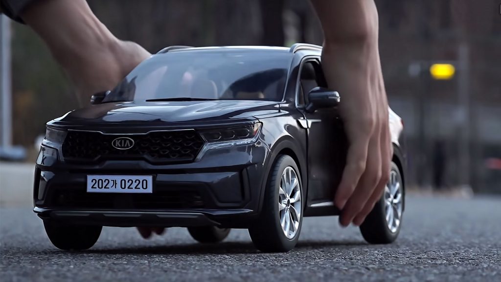 Tässä on aivan uskomatonta tarkkuutta toteuttava Kia Sorento MQ4 -pienoismalli. Auton mittakaava on 1:10 suhteessa alkuperäiseen ja sen rakensi E-Korean Lee Sang-won. Hän on pienoismalli-autojen modaaja, ja tämän (muovisen) pienoismallin tilasi häneltä Kia Motors.