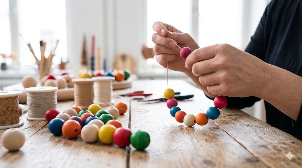 - Keväiset ja kesäiset värit tuovat puuhelmet osaksi arkisisustusta.